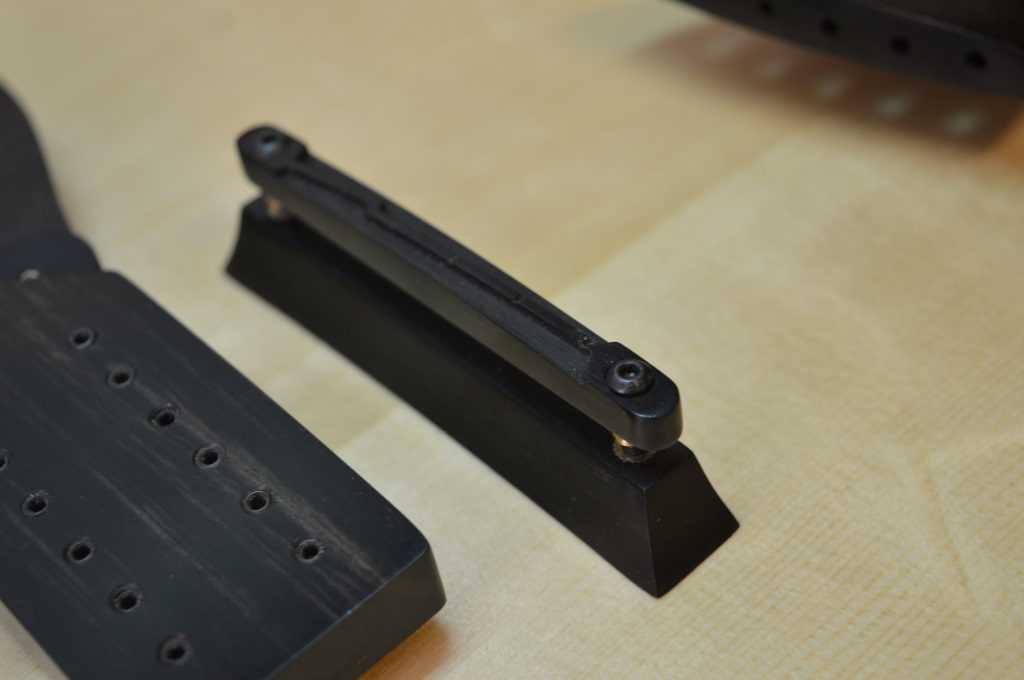 The foot is hollow, very light. The saddle is made of ebony externally, but that is just the “skin”. It has a core of pultruded carbon fiber inside (pultruded means that all the fibers are oriented the same). The adjustment mechanism is smaller and lighter than the conventional thumbwheels.