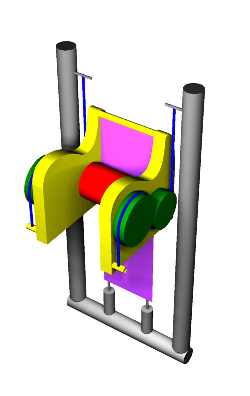 The chassis (the stationary part of the machine) is represented in yellow. There is a piece, which we will call the “bridge”, colored grey. It has two pneumatic cylinders below, pulling an end of the slat/heater/wood/slat layered arrangement (purple) that we will call the “sandwich”, the other end of which is attached to the chassis. This has the already known detachable blocks (in red), but this figure represents only one, as the other has not been placed yet (the figure above this one shows both). Notice that there are more blocks (green) located outside the chassis, the same shape and size as the inner blocks (not always, but basically true for this explanation — more on this later) and in line with them. All the blocks, inner and outer, are firmly attached to the chassis, and they can be placed and removed independently. Notice that, although the second inner block is absent, its corresponding outer blocks are present. Finally, there are two wire ropes (blue) that go from a point firm on the chassis to each leg of the bridge, along the perimeter of the outer blocks. You will notice that the bridge is in equilibrium between two tensions on its ends: that exerted by the sandwich and that exerted by the wire ropes. In what follows, for the sake of clarity, we will not draw the chassis. The points or pieces that must be attached to it are identified by a yellow surface, as shown in this figure: