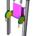 Notice that the effort to change the position has been light, as the mechanism has been constantly guiding the pull tangentially to the inner/outer blocks. Modifying the size of the outer blocks has a definite effect on that effort. We can take advantage of it to achieve a self-leveling (or almost) bridge, that can balance its own weight, freeing the operator from holding or clamping it between operations. Now look at the wire ropes. They have become unwound from the small outer blocks, having contact only with the other two. Arriving at this position has been smooth, keeping the tension on the sandwich constant. In fact, the initial position is still recoverable if we set the bridge back to where it was. Now it is time to place the second inner block (red) and remove the two outer blocks (green) that were in line with the first inner block:
