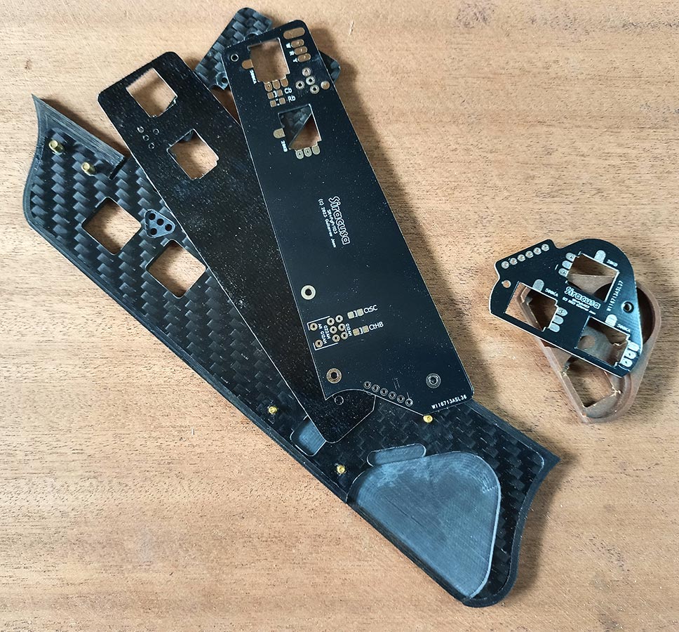 Notice the thin fiberglass shim between the PCB and the pickguard. It separates it from the carbon fiber skeleton, because carbon fiber is conductive and will cause short circuits quite easily. There is also a small shim right where the pickup terminals go through the pickguard (not shown).